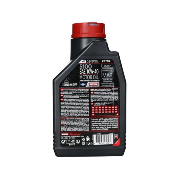 ACEITE MOTUL 10W-40 5100 1L 4T Semi-Sintético: Protección superior para tu moto. Tecnología Technosynthese® para mayor rendimiento y durabilidad. Cumple con las normas API SP y JASO MA2.