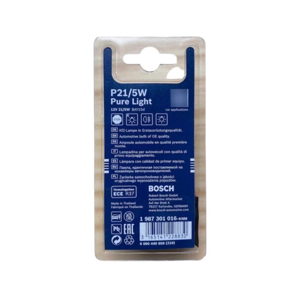 Ampolleta Bosch P21/5W 12V Pure Light en blister. Luz halógena confiable para frenos y luces traseras. Alta durabilidad y fácil instalación.