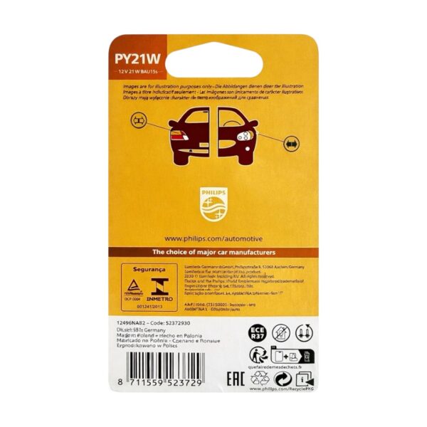 Ampolleta Philips PY21W 12V 21W para luces de viraje e intermitentes. Alta duración, vidrio resistente al calor y base BAU15S.