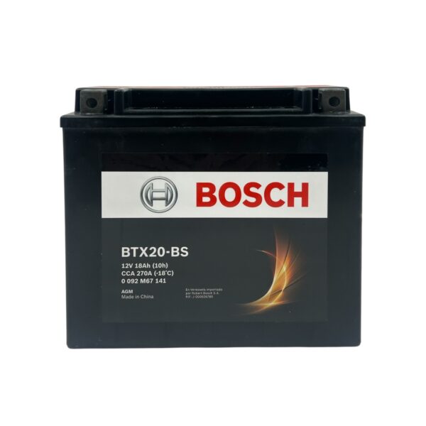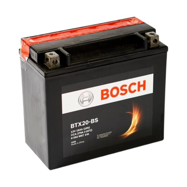 Batería Bosch BTX20-BS de 18 Ah y 270 CCA, diseñada para motociclismo. Ofrece un rendimiento confiable y duradero en condiciones exigentes.