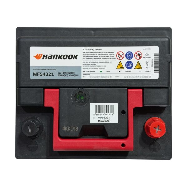 La Hankook 45 Ah Mf54321 450CCA (-18C) es de origen Coreano y esta misma pertenece a la línea de baterías MF (que significa maintenance free por sus siglas en inglés), este tipo de batería no necesitan de un mantenimiento a lo largo de toda su vida útil.