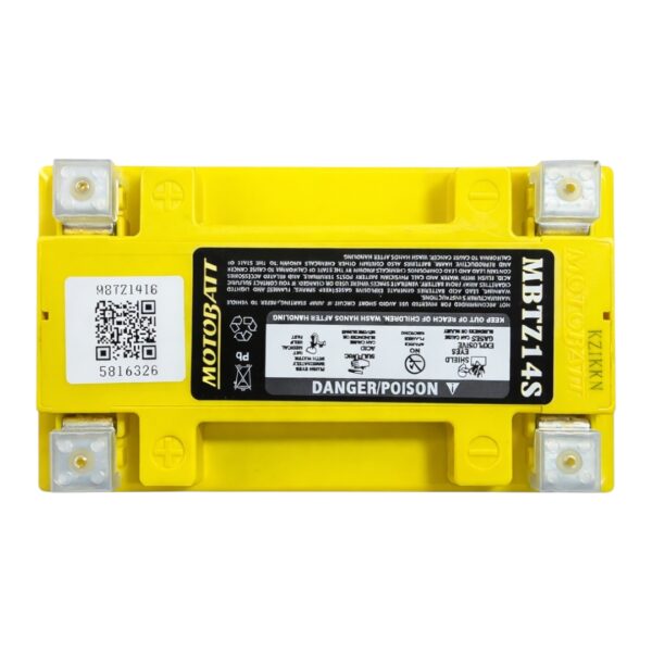 Batería Motobatt MBTZ14S 12 V AGM con 11.5 Ah de capacidad real y 170 CCA. Diseño AGM sellado de alto rendimiento, sin mantenimiento y con terminales reforzados para un arranque eficiente y duradero en motos y scooters.