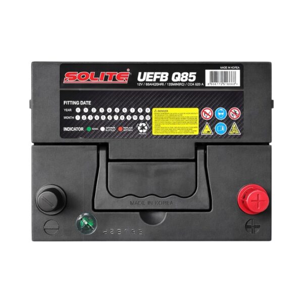 Batería Solite Q85: 65 Ah y 620 CCA, potencia avanzada para vehículos Start-Stop y rendimiento confiable en climas extremos.