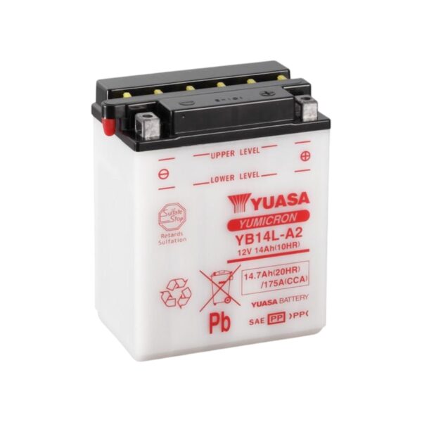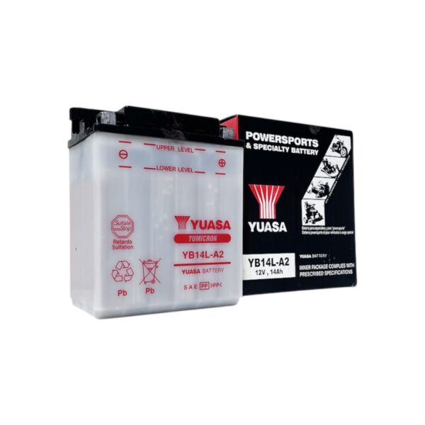 Batería Yuasa YB14L-A2 con 14 Ah y 175 CCA, ideal para motocicletas de uso diario y recreativo.