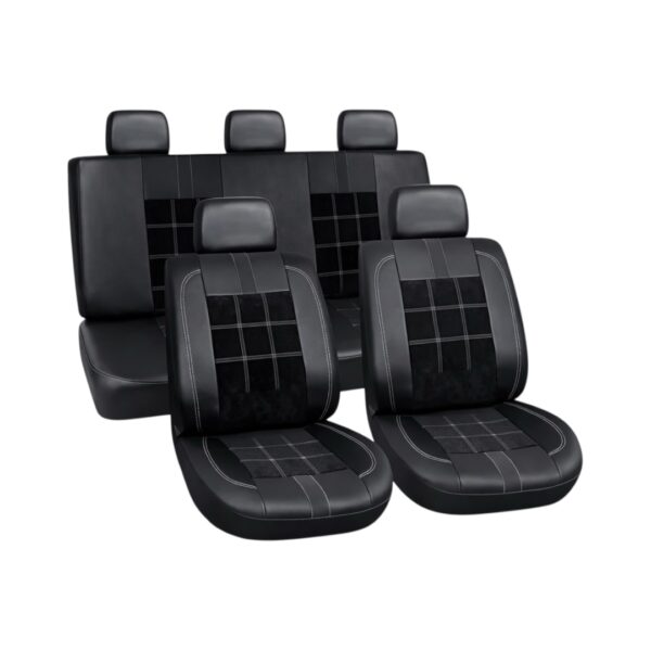Este set de 11 piezas cubre por completo los asientos delanteros y traseros, adaptándose perfectamente gracias a su corte exacto y ajuste universal. El material de eco cuero combinado con gamuza no solo brinda una apariencia refinada, sino también una sensación suave al tacto, lo que mejora notablemente la experiencia de conducción y el confort.