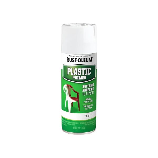 Imprimante para plástico Rust-Oleum en aerosol, blanco satinado, fácil aplicación sin lijar, para interiores y exteriores. Secado rápido y alta adherencia.