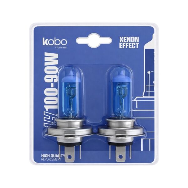 Kit de ampolletas KOBO Xenon Effect H4 P43T 12V 100/90W, con luz blanca tipo xenón que mejora la visibilidad y da un aspecto moderno al vehículo. Alta y baja en una sola lámpara, fácil instalación y excelente rendimiento nocturno.
