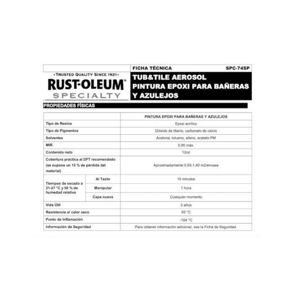La Pintura Para Tina Bañera Azulejos Lavamanos Rust Oleum es una pintura acrílica epoxy en aerosol que ofrece una solución de un solo paso para bañeras, lavatorios y duchas en minutos. Este acabado único se adhiere firmemente en superficies de porcelana y cerámica y tiene una gran durabilidad y retención de color superior en áreas de alta humedad.
