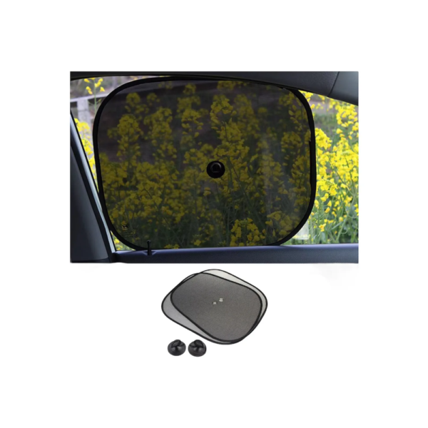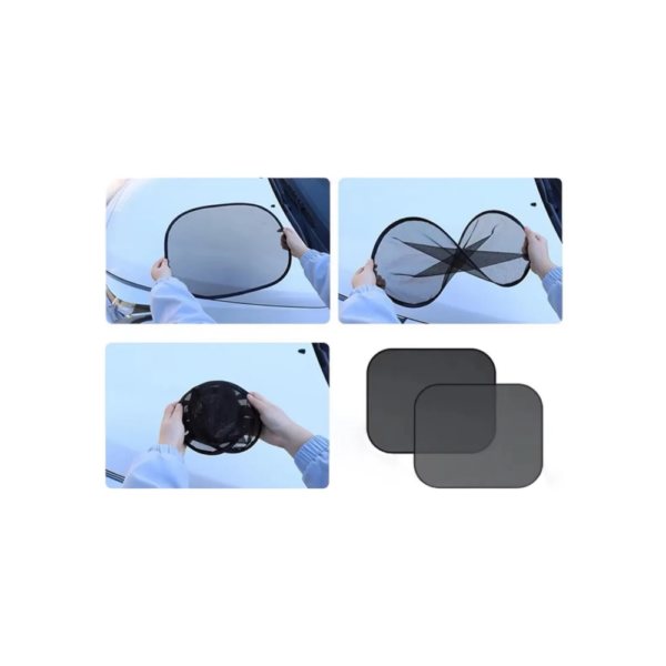El set incluye dos sombrillas laterales, diseñadas para instalarse fácilmente en las ventanas del vehículo mediante sistema de fijación simple, permitiendo colocarlas y retirarlas rápidamente cuando sea necesario.